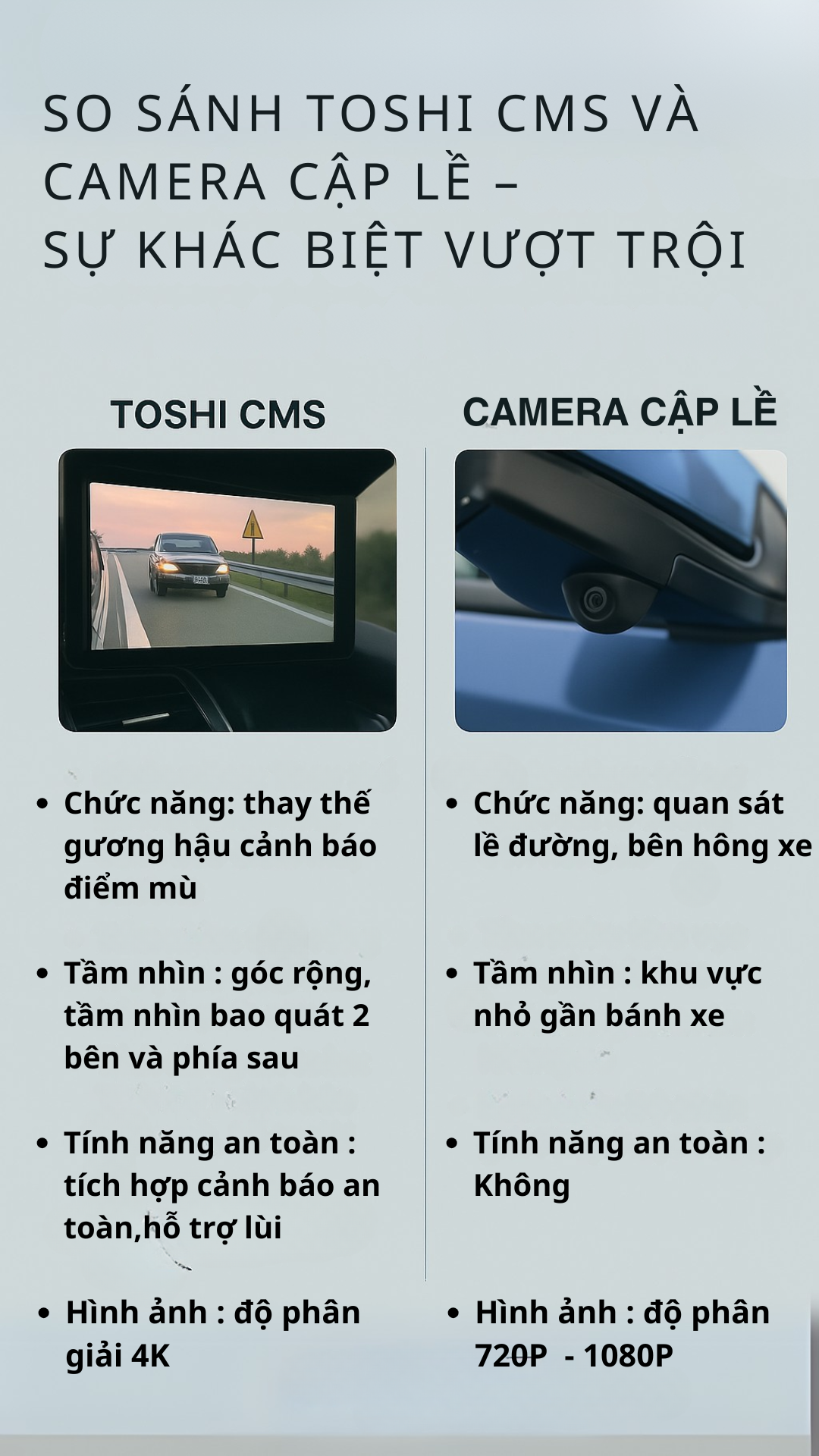 Không, Toshi CMS không phải là camera cập lề. Đây là hệ thống gương chiếu hậu điện tử thay thế gương truyền thống, cung cấp tầm nhìn toàn diện với góc nhìn 170 độ, độ phân giải 4K, và các tính năng an toàn như cảnh báo điểm mù, vượt xe. Camera cập lề chỉ hỗ trợ quan sát lề đường bên hông xe, không có các tính năng nâng cao như Toshi.