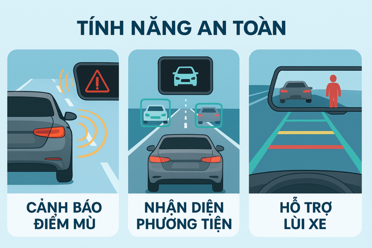 – Tính năng an toàn: Cảnh báo điểm mù, vượt xe, nhận diện phương tiện, hỗ trợ lùi xe.